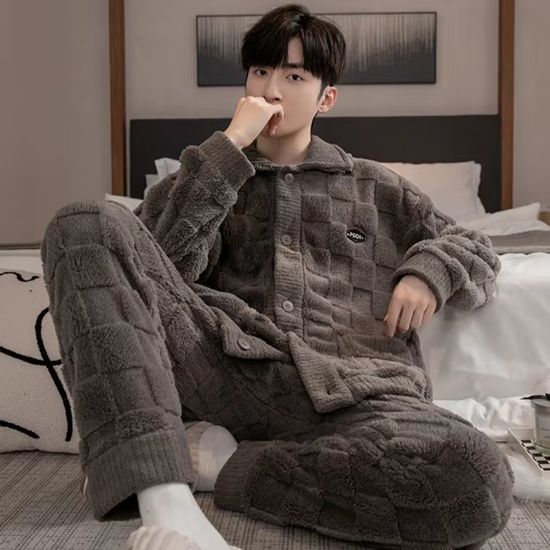 2Pcs/Set Men’S Pajamas Autumn and Winter Padded and Thickened Warm Long-Sleeved Trousers Coral Fleece Homewear Men’S Clothing