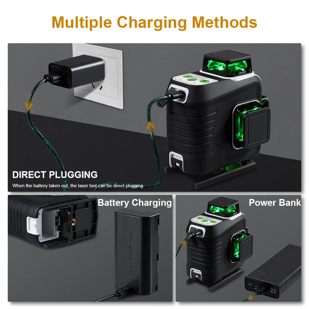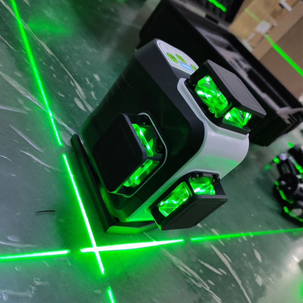 Off state, press and hold the middle button for about 3 seconds, the left side indicator will turn green.The laser line flashes slowly and can be operated at the angle you choose, Single-press middle button to adjust brightness cyclically, three gears are available. To turn off the measuring tool, just press and hold the middle button for 3 seconds.