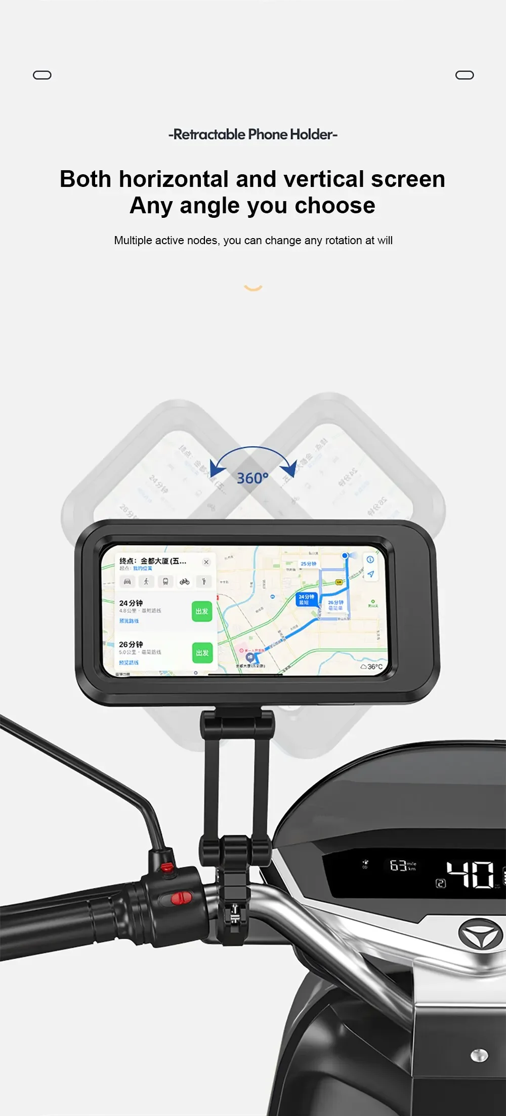 • Giratorio de 360 grados: el soporte puede girar 360 grados, lo que le permite ajustar el ángulo de su teléfono para una visualización óptima mientras conduce.